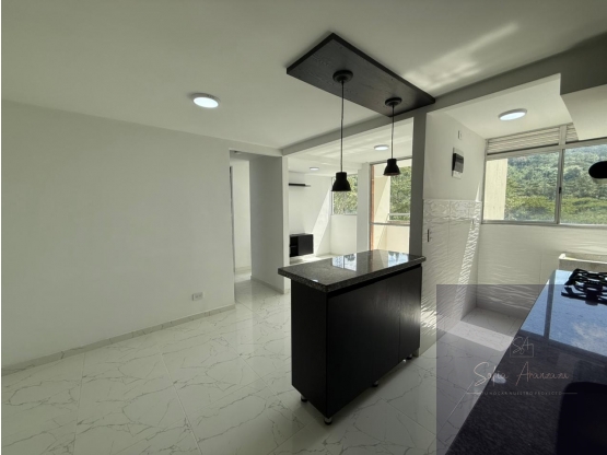 Si te gusta la vista tranquila, verde y a la montaña, este apartamento es para ti, excelente distribucion, 2 habitaciones, estudio con posibilidad de tercera, principal con baño privado, cocina abierta con barra y espacios para almacenamiento, zona de ropas ventilada, baño social completo, salón comedor y balcón. Unidad con completas zonas comunes, piscina de niños y adultos, gym, salón social, juegos infantiles, zona de mascotas, portería 24/7, no tiene parqueadero privado, son comunes. Unidad de solo dos torres.